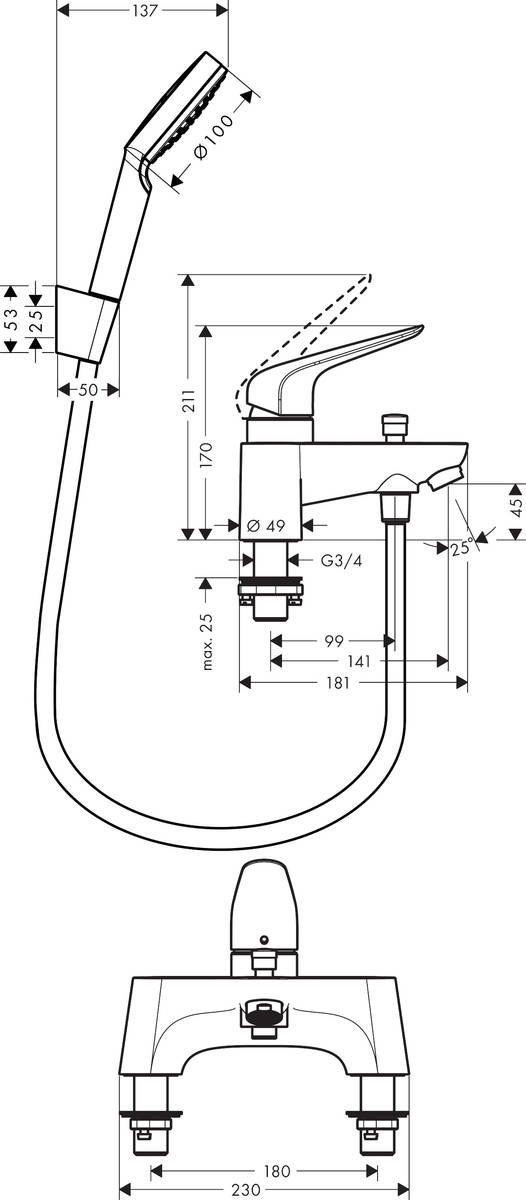tartalmazza a következőket: 2-lyukú peremre szerelhető kádcsaptelep, kézizuhany, zuhanytartó, zuhanycső