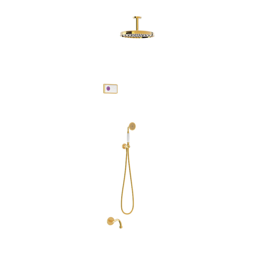 Tres Clasic falba süllyesztett, elektromos,  termosztátos kád csaptelep, kézizuhannyal és esőztetővel arany 09226302ORTres Clasic falba süllyesztett, elektromos, termosztátos kád csaptelep, kézizuhannyal és esőztetővel arany 09226302OR
