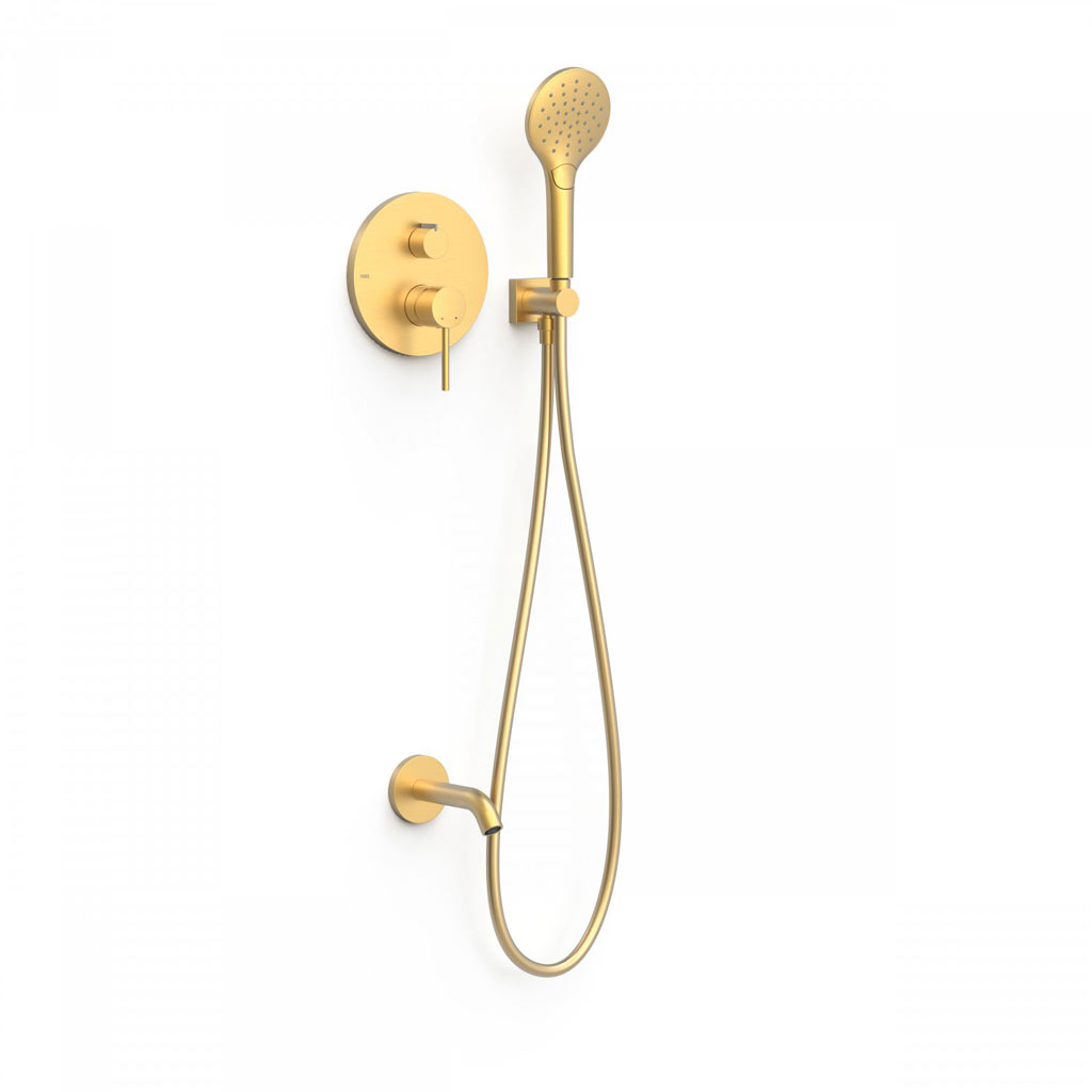 Tres Study Exclusive falba süllyesztett zuhany és kádtöltő csaptelep, szatén tömlős kézizuhannyal, matt arany 26228060OM