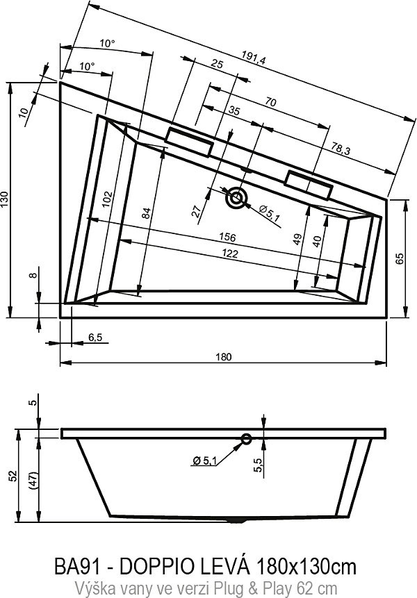 Riho Doppio Plug & Play Bal aszimmetrikus kád 180x130 cmRiho Doppio Plug & Play Bal aszimmetrikus kád 180x130 cm