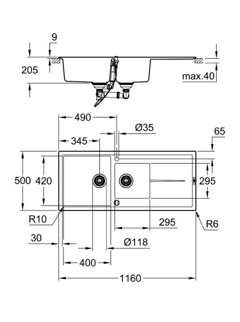 Grohe K400 Kompozit mosogatótálca csepegtetővel 1160x500 mm, gránit fekete 31643AP0