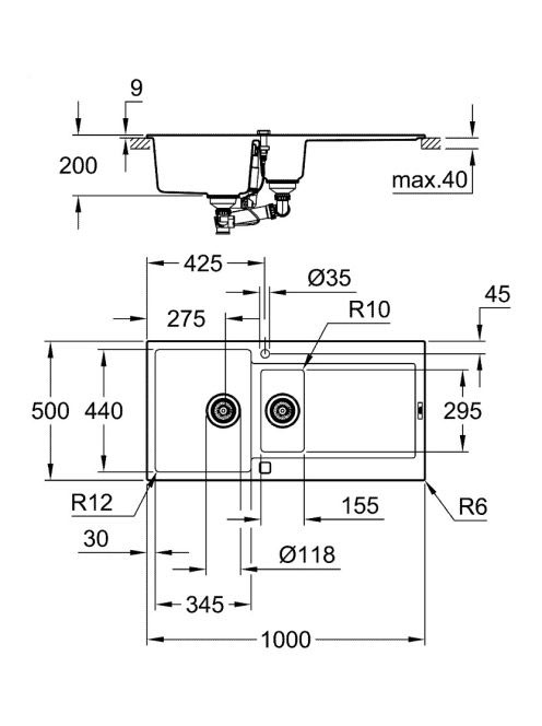 Grohe K500 Felülről beépíthető kompozit mosogatótálca csepegtetővel 1000x500 mm, gránit fekete 31646AP0