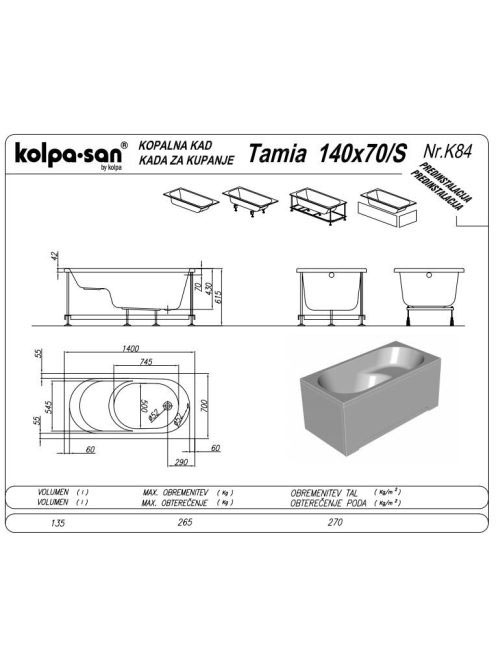 Kolpa San Tamia beépíthető ülőkád 140x70 cm, fehér 752940