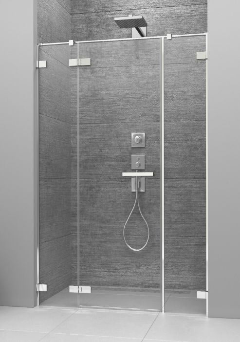 Kifelé-befelé nyíló zuhanyajtó két fix fal között.